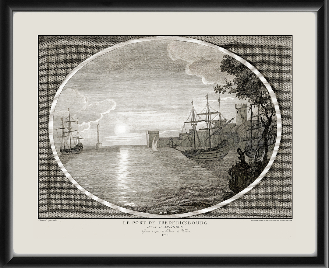 Restored bird’s eye view of the port of Fredericksburg, Virginia, 1780 – “Le Port de Fredericsbourg dans l’Amerique” – drawn by Claude Joseph Vernet and engraved by Friedrich Albert Anner