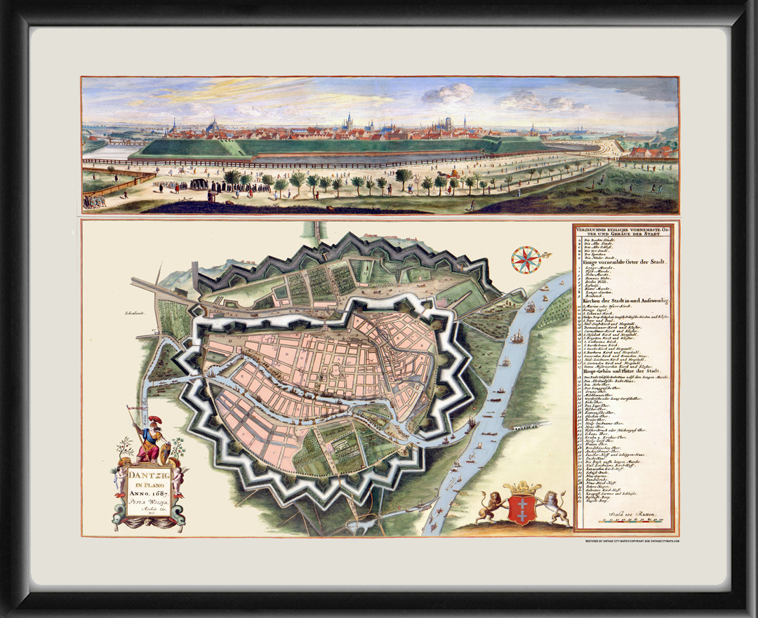 Restored plan and panoramic view of Gdansk (Danzig in German), Poland, 1687 by Peter Willer