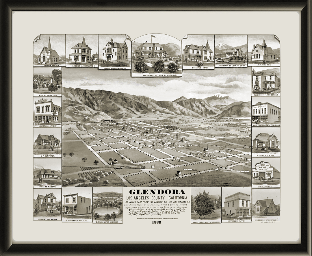Restored bird’s eye view map of Glendora, California, 1888 by H.S. Crocker.