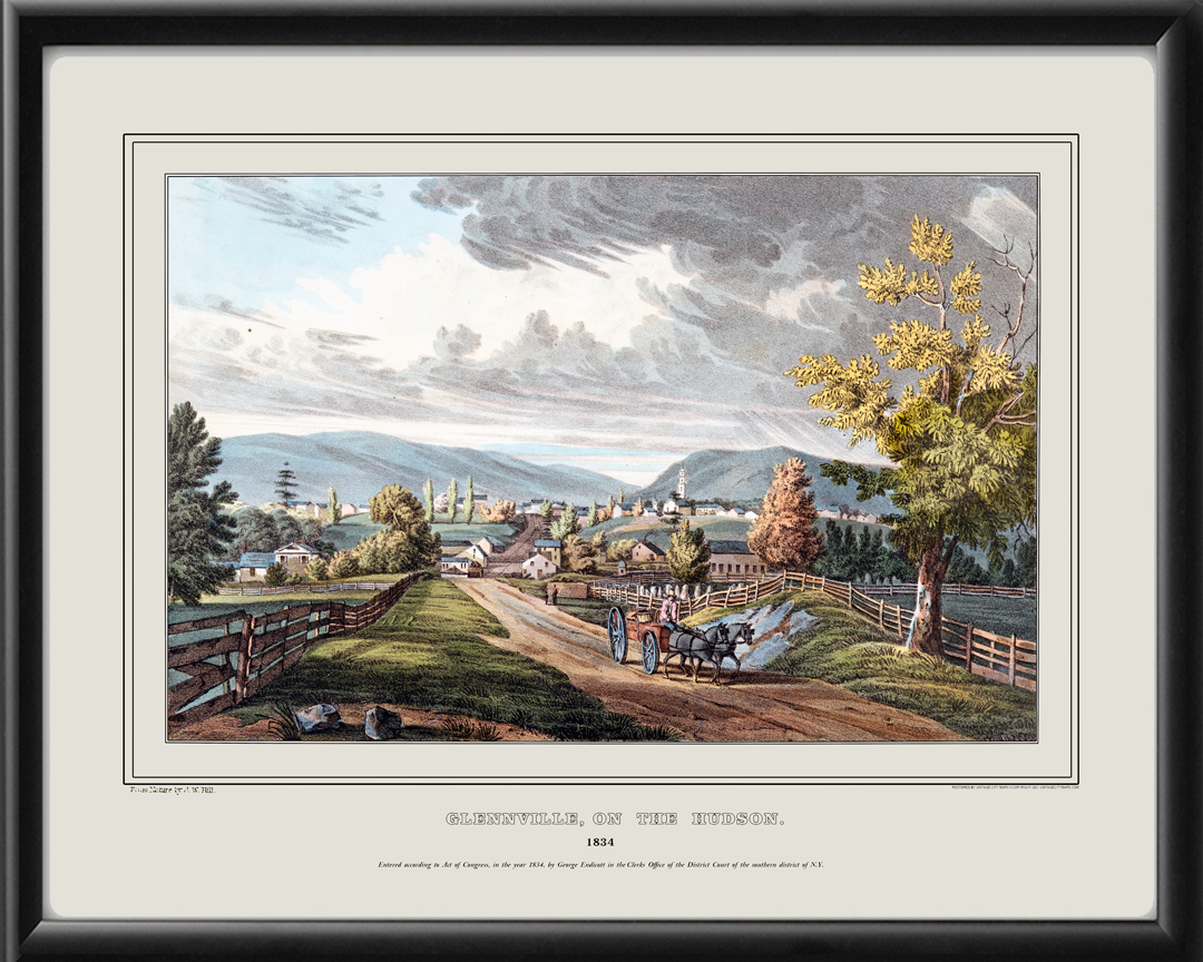 Restored panoramic view of Glennville (Glens Falls), N.Y., 1834 by John William Hill.