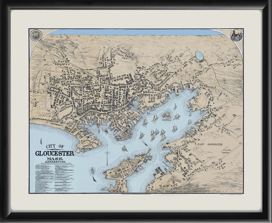 Restored bird’s eye view map of Gloucester, Massachusetts, circa 1873 published by Franklin Litho. Co.