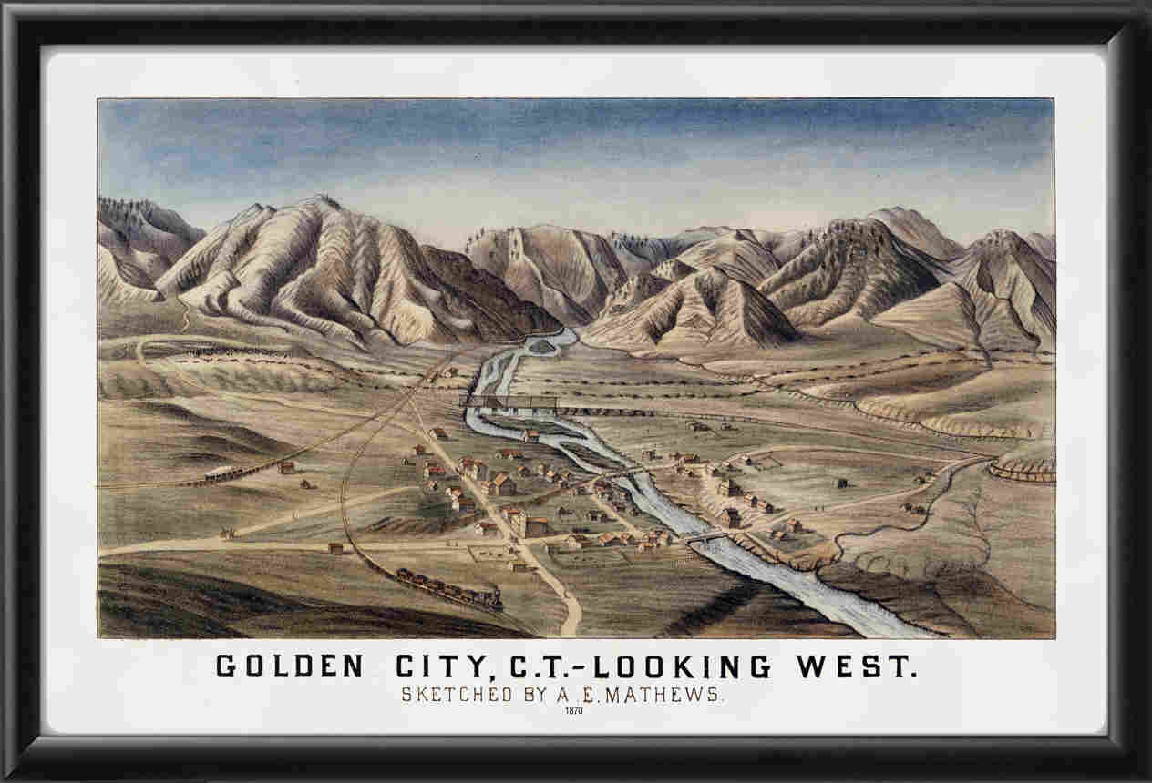 Restored bird’s eye view map of Golden, Colorado, looking West, 1870 by Alfred E. Mathews.