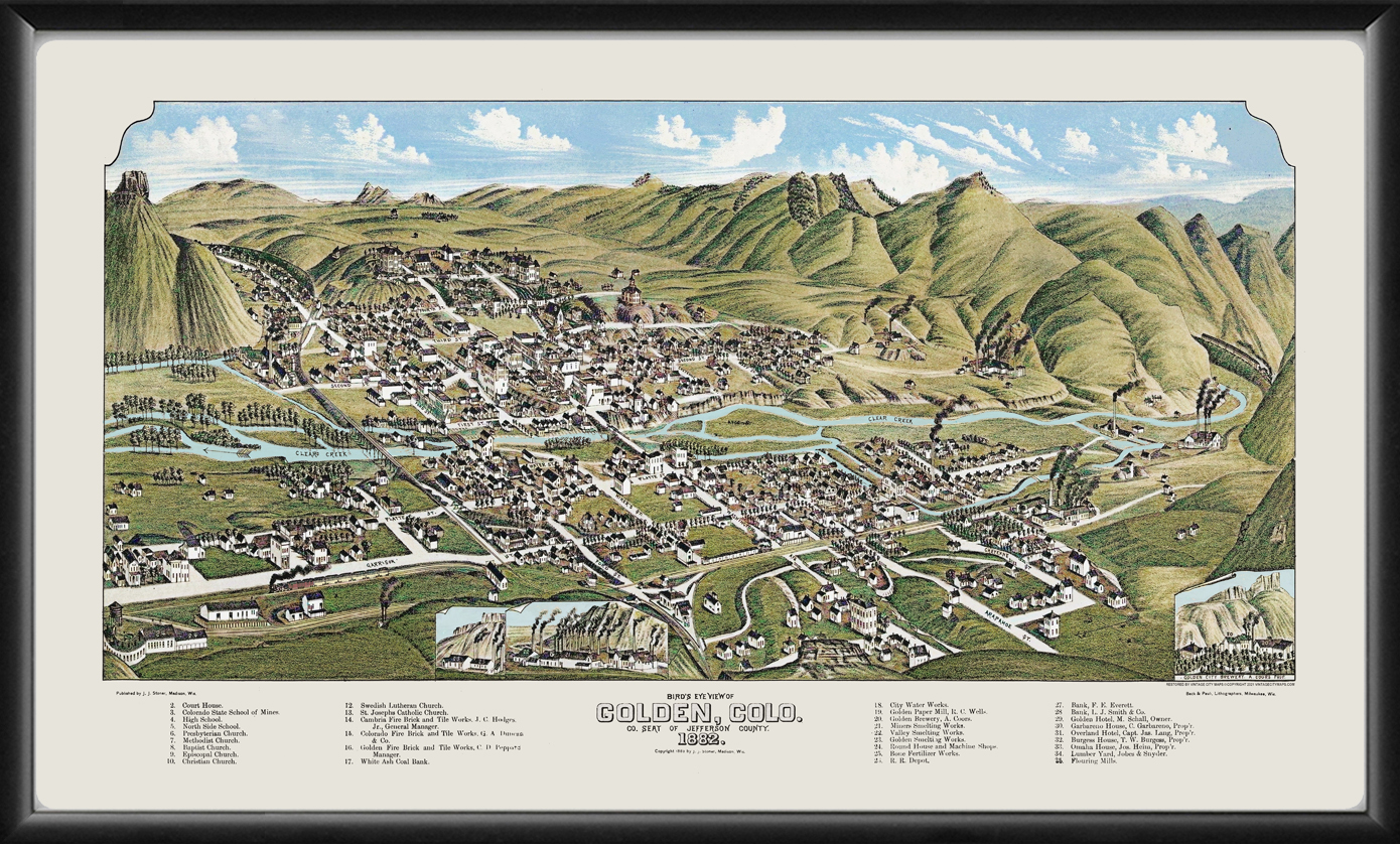 Restored and colored bird’s eye view map of Golden, Colorado, 1882 by J. J. Stoner.