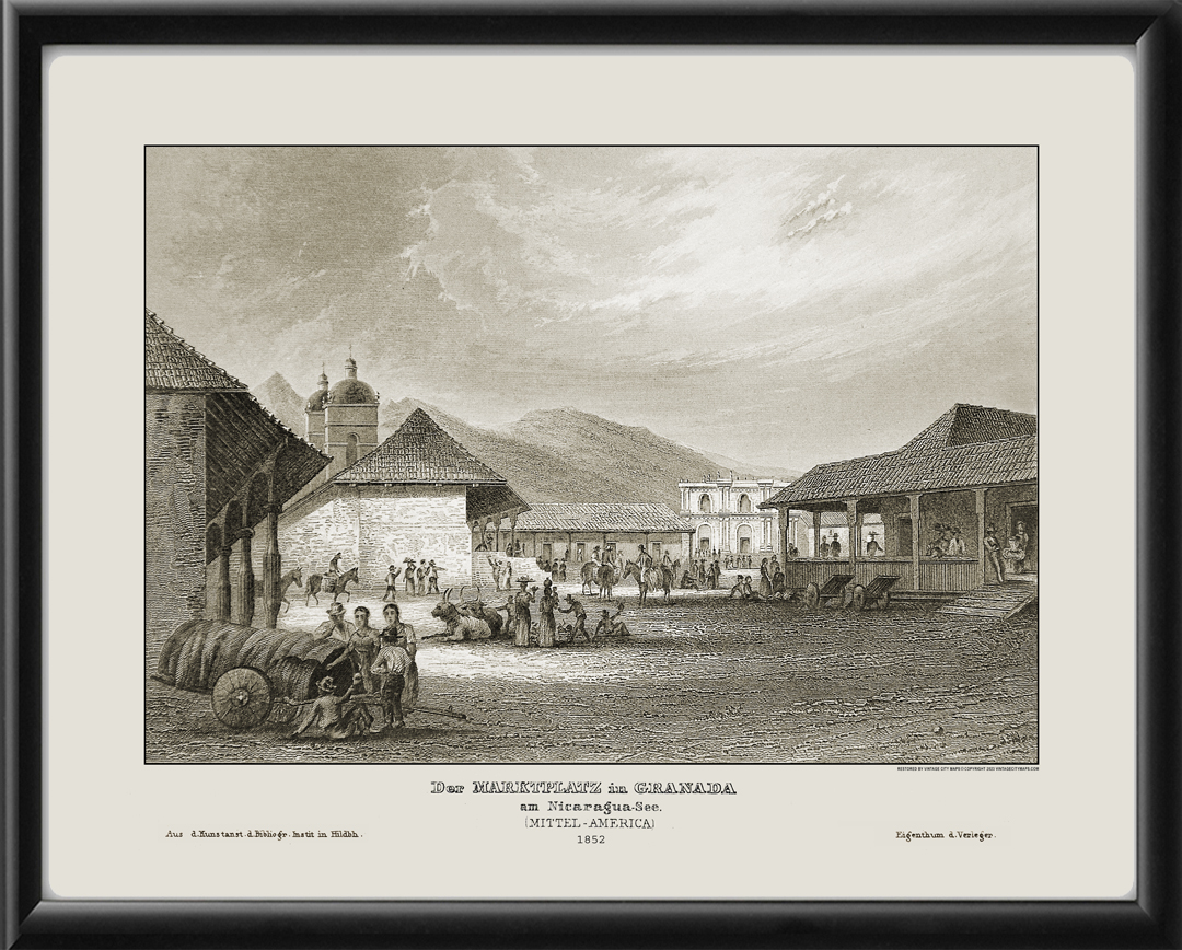 Restored panoramic view of Der Marktplatz in Granada, Nicaragua, 1852, by Eigenthum d. Verleger.