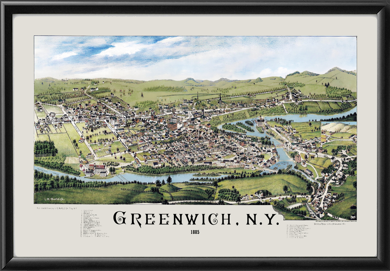 Restored bird’s eye view map of Greenwich, New York, 1885, by Lucien R. Burleigh.