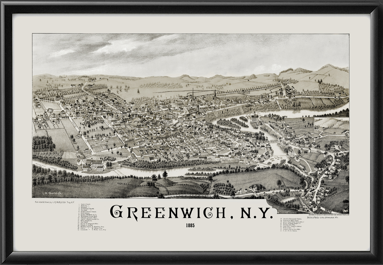 Restored bird’s eye view map of Greenwich, New York, 1885, by Lucien R. Burleigh.