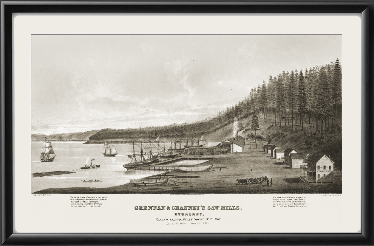 Restored view of Grennan & Cranney’s Saw Mills in Utsalady, Camano Island in Puget Sound, Washington Territory, 1862 by Charles B. Gifford.