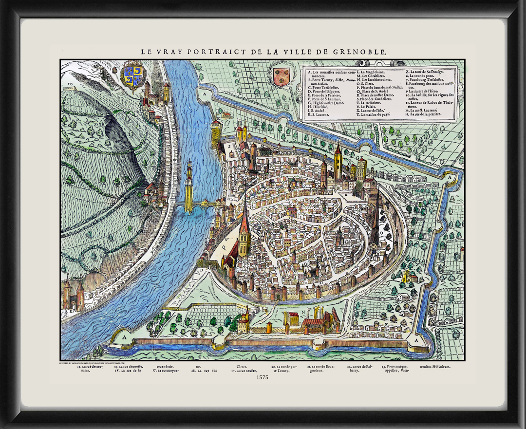 Restored bird’s eye view map of Grenoble, France, 1575 from the original engraving by Francois de Belleforest