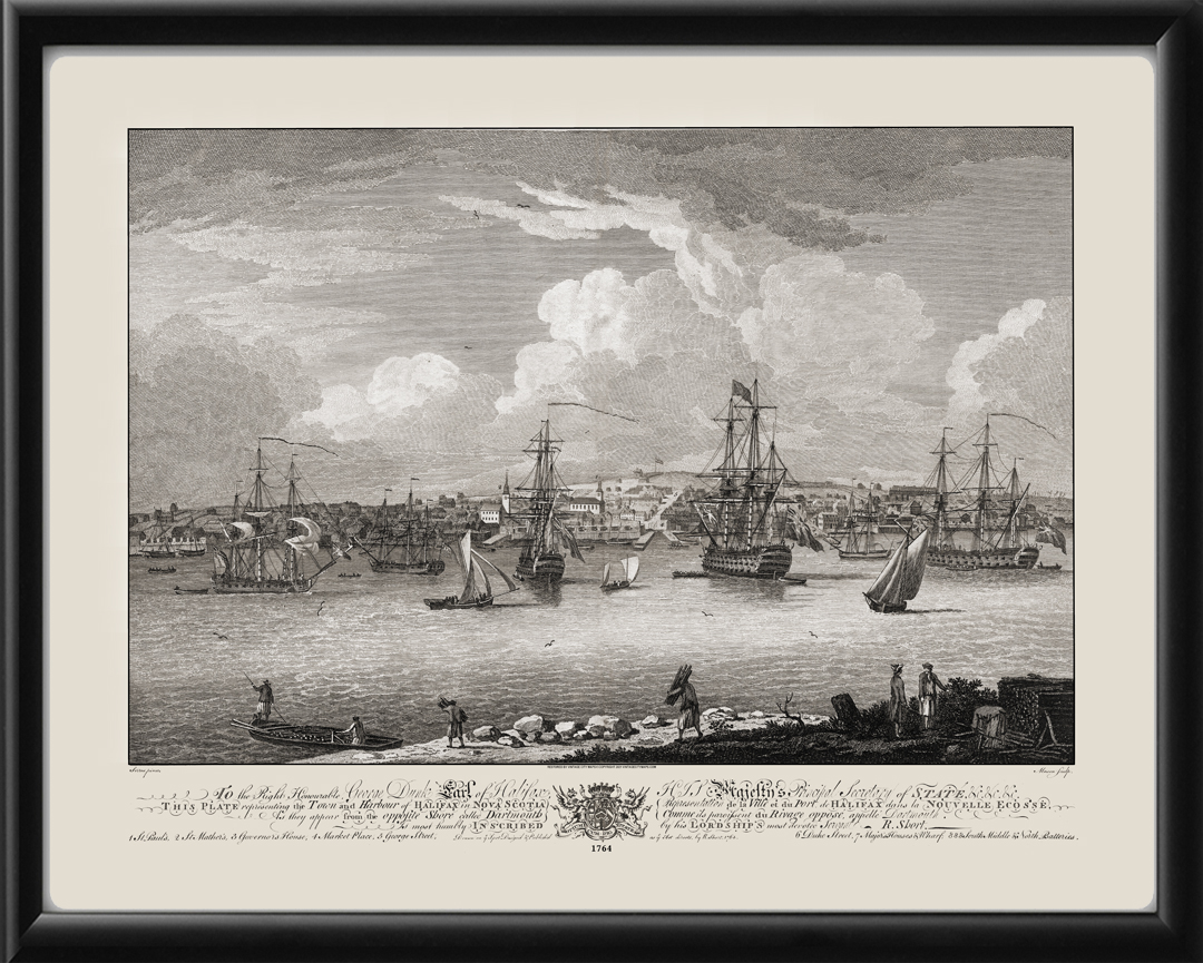 Restored panoramic view of the city and harbor of Halifax, Nova Scotia, Canada, 1764 as viewed from the city of Dartmouth, by Dominac Serres & James Mason.