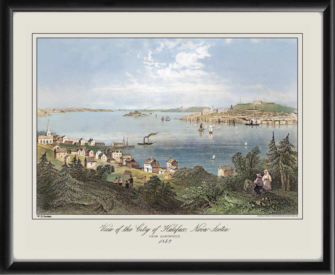 Restored bird’s eye view of Halifax, Nova Scotia, Canada from Dartmouth, 1842 by William Henry Bartlett.