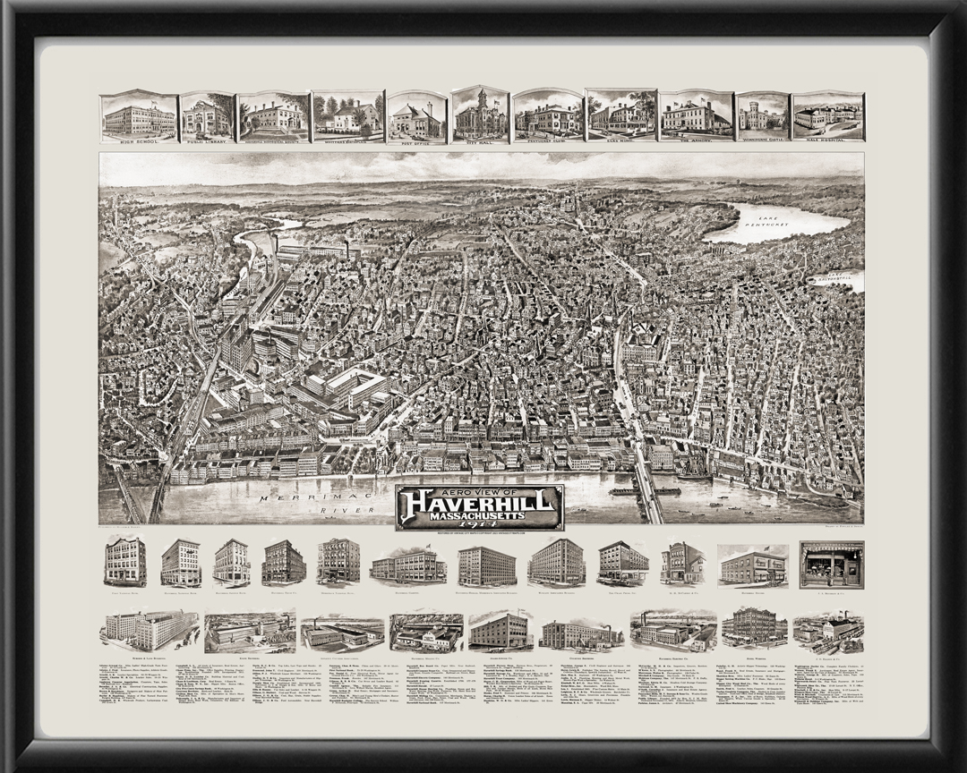 Restored bird’s eye view map of Haverhill, Massachusetts, 1914 by Thaddeus Mortimer Fowler and Albert E. Downs.