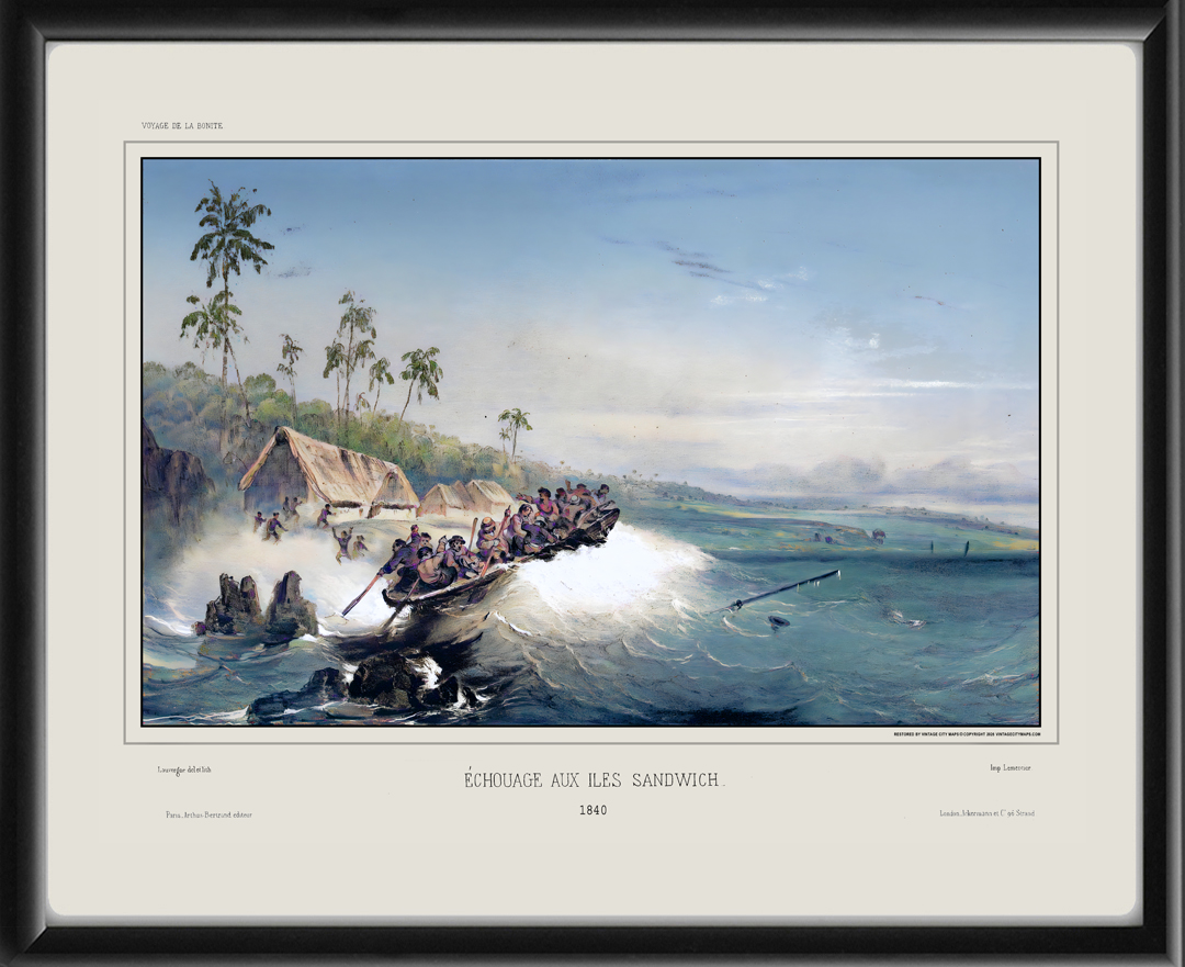 Restored bird’s eye view of Stranding in the Sandwich Islands – Hawaii, 1840 during the “Voyage de la Bonite” by French artist Barthélemy Lauvergne