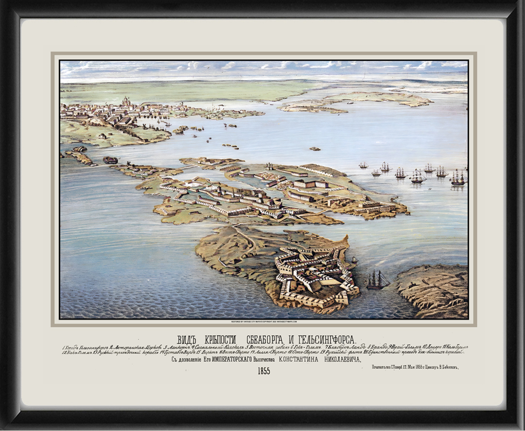 Restored bird’s eye view of the fortress of Sveaborg and Helsingfors (Helsinki), Finland, 1855