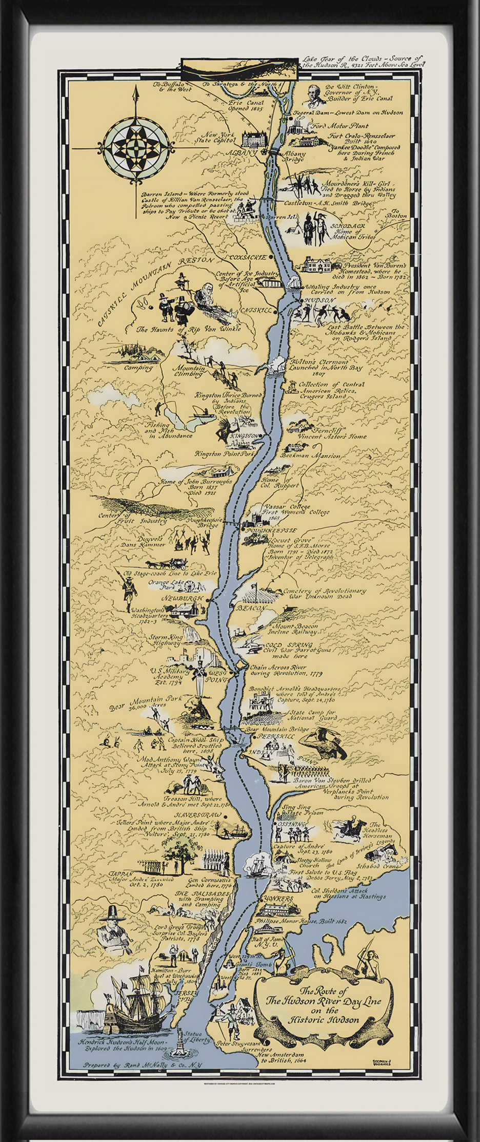 Restored bird’s eye view map of the Historic Hudson River of Picturesque Charm – Route of the Hudson River Day Line on the Hudson, showing vignettes of historic events, people, and places along the Hudson from the Statue of Liberty north to Albany and the Erie Canal, produced in 1929 by Stephen J. Vorhees.
