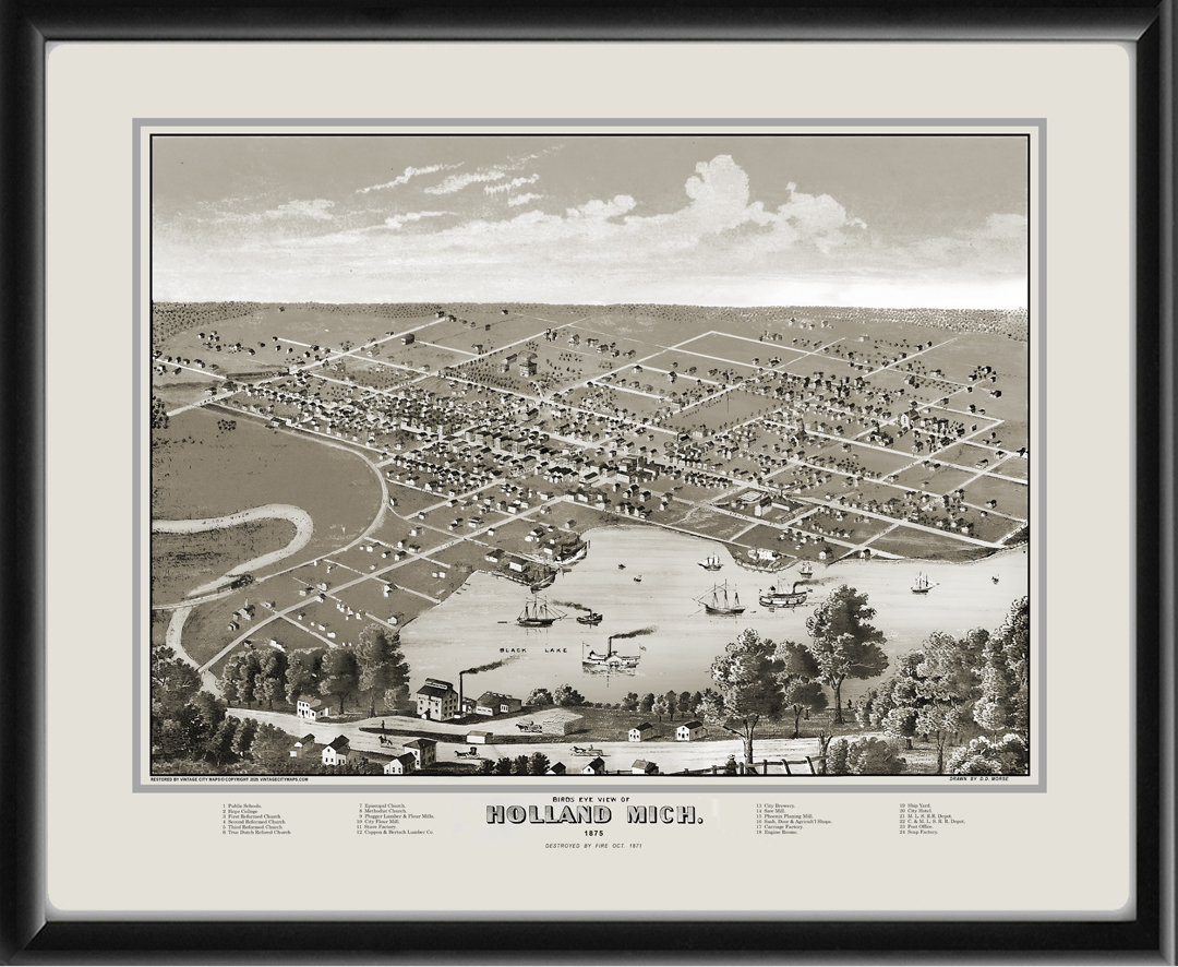 Restored bird’s eye view map of Holland, Michigan, 1875 by D.D. Morse