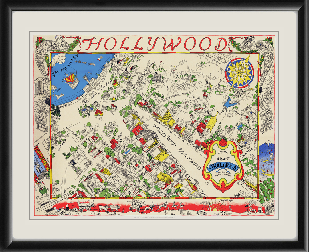 Restored whimsical pictorial bird’s eye view map of Hollywood (Los Angeles), California, 1926, derived from the best surveys of the time, drawn by Hollywood costume and set designer Harold Grieve