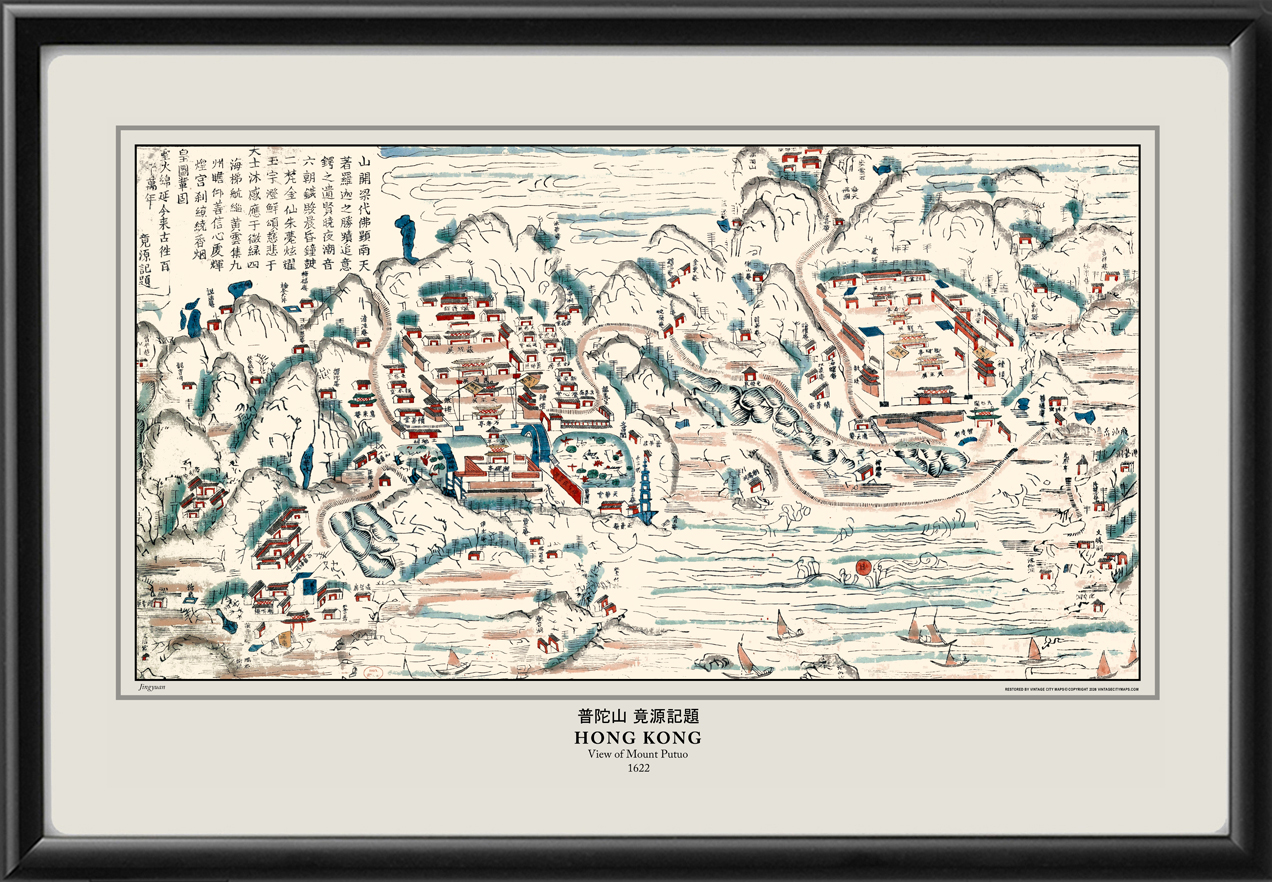 Restored bird’s eye view of Hong Kong, China with view of Mount Putuo 普陀山 竟源記題 1622, by Jingyuan
