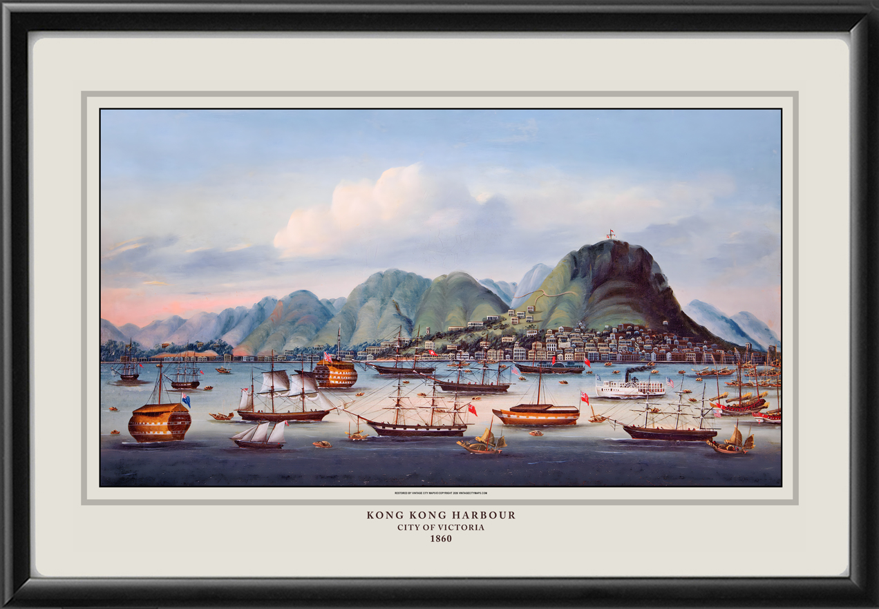 Restored panoramic view of Hong Kong Harbor and the city of Victoria, from the original oil painting, circa 1860