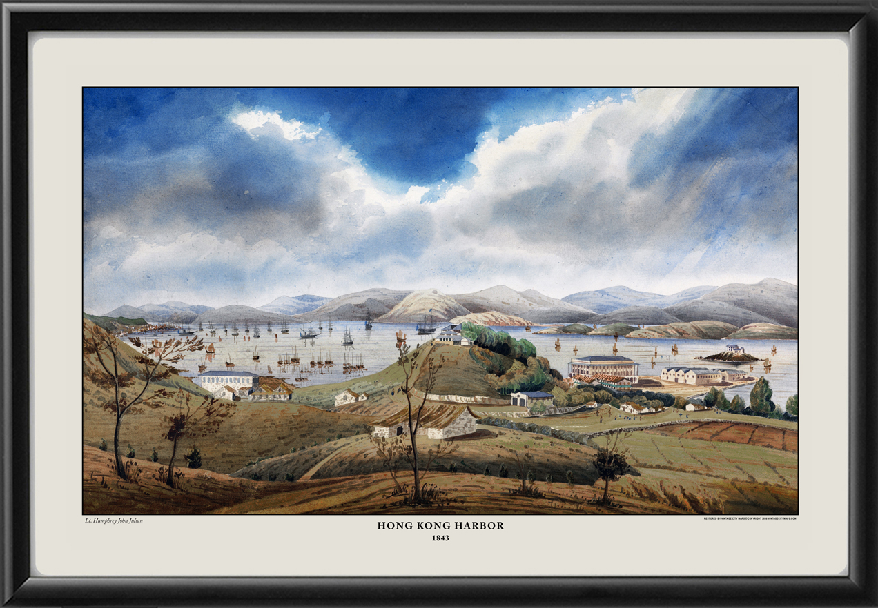 Restored bird’s eye view of Hong Kong Harbor, 1843, from the original watercolor by Lt. Humphrey John Julian
