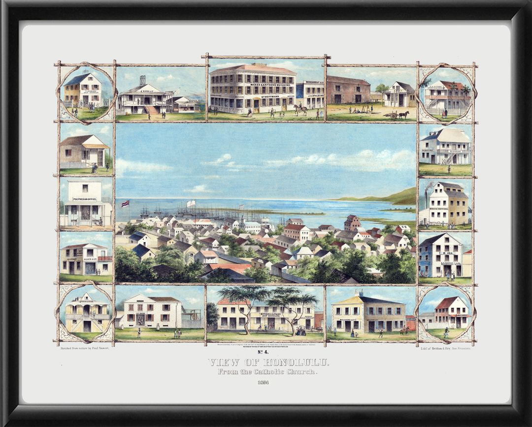 Restored bird’s eye view of Honolulu, Hawaii (#4), 1854 by Paul Emmert. Viewed from the Catholic Church.