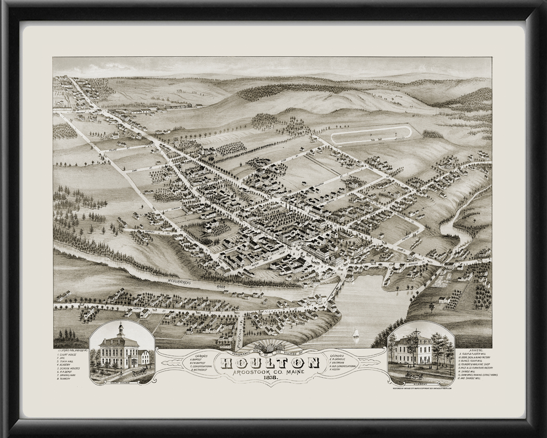 Restored bird’s eye view map of Houlton, Maine, 1878 by Albert Ruger.