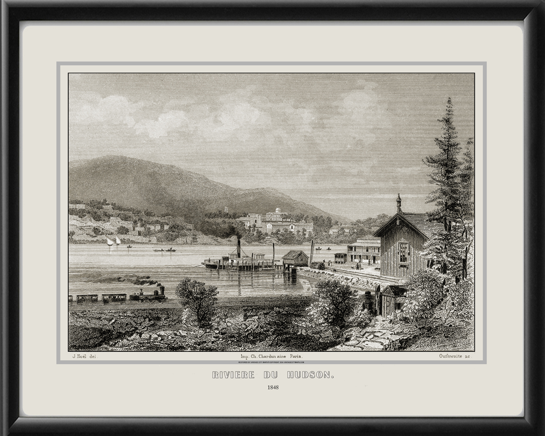 Restored bird’s eye view of the Hudson River and the United States Military Academy at West Point, viewed from Garrison Landing, 1848 French artist J. Noel
