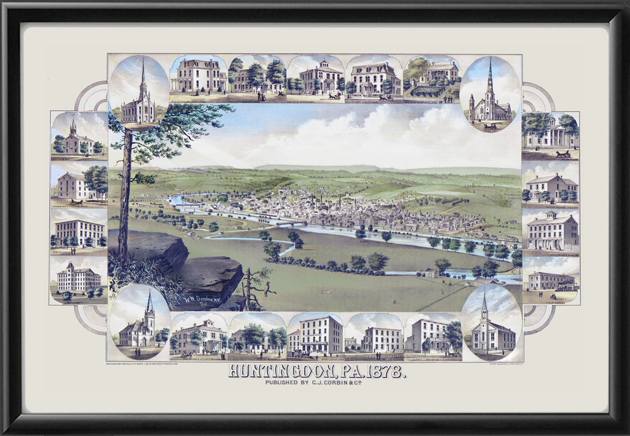 Restored panoramic view of Huntingdon, Pennsylvania, 1878 by W. W. Denslow.