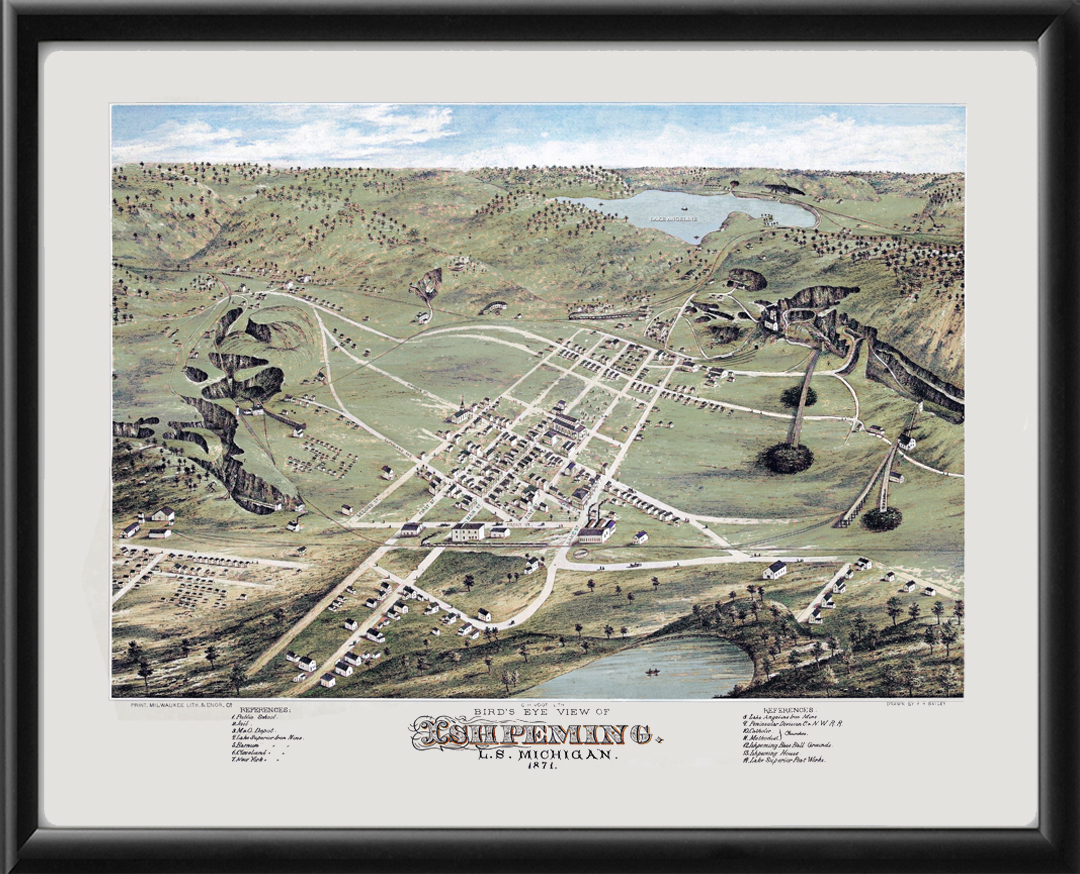 Restored bird’s eye view map of Ishpeming, Michigan, 1871 by Howard Heston Bailey.