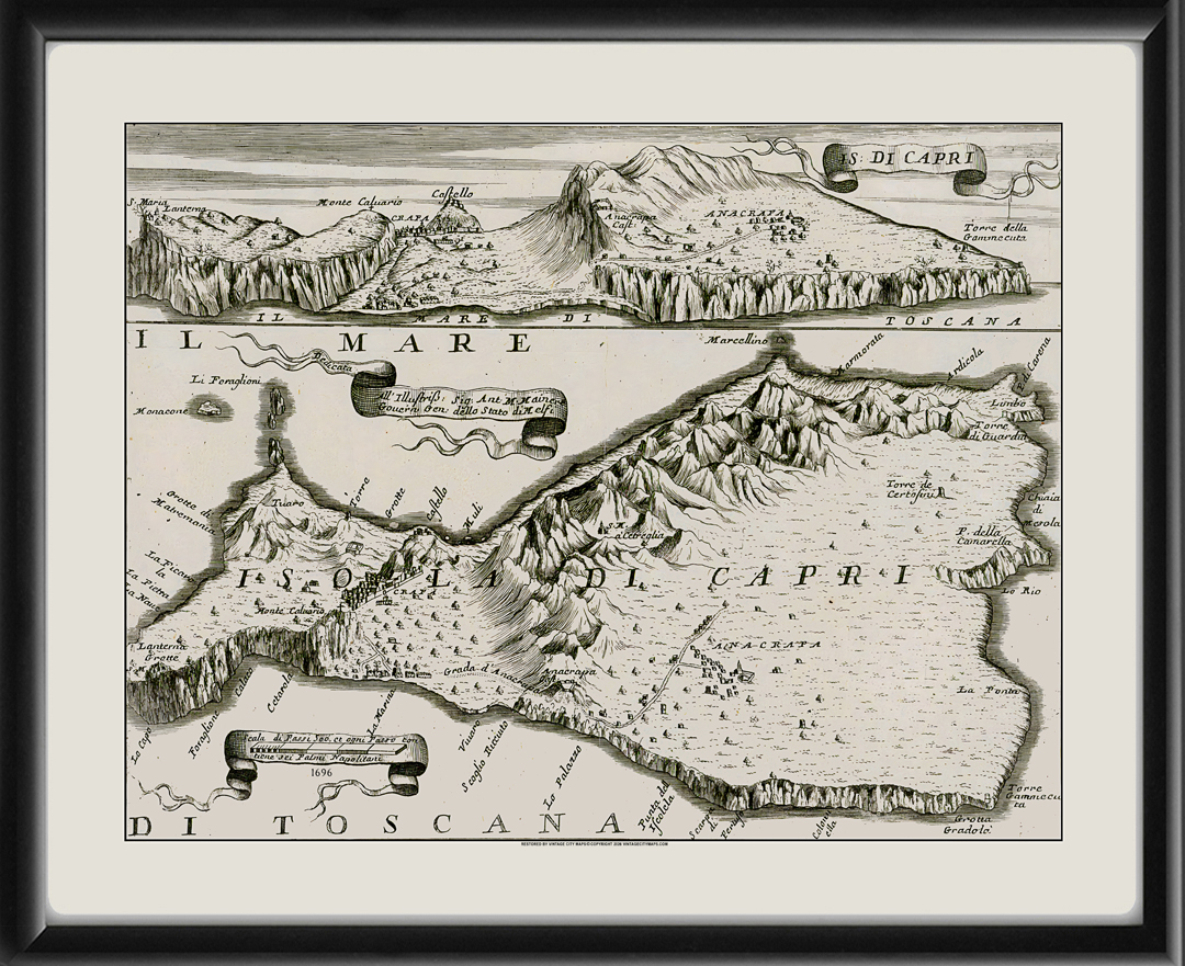 Restored map of Isola di Capri, Italy, 1696 by Italian cartographer Vincenzo Coronelli with an additional panorama view, showing topographical features, fortifications, and place names.