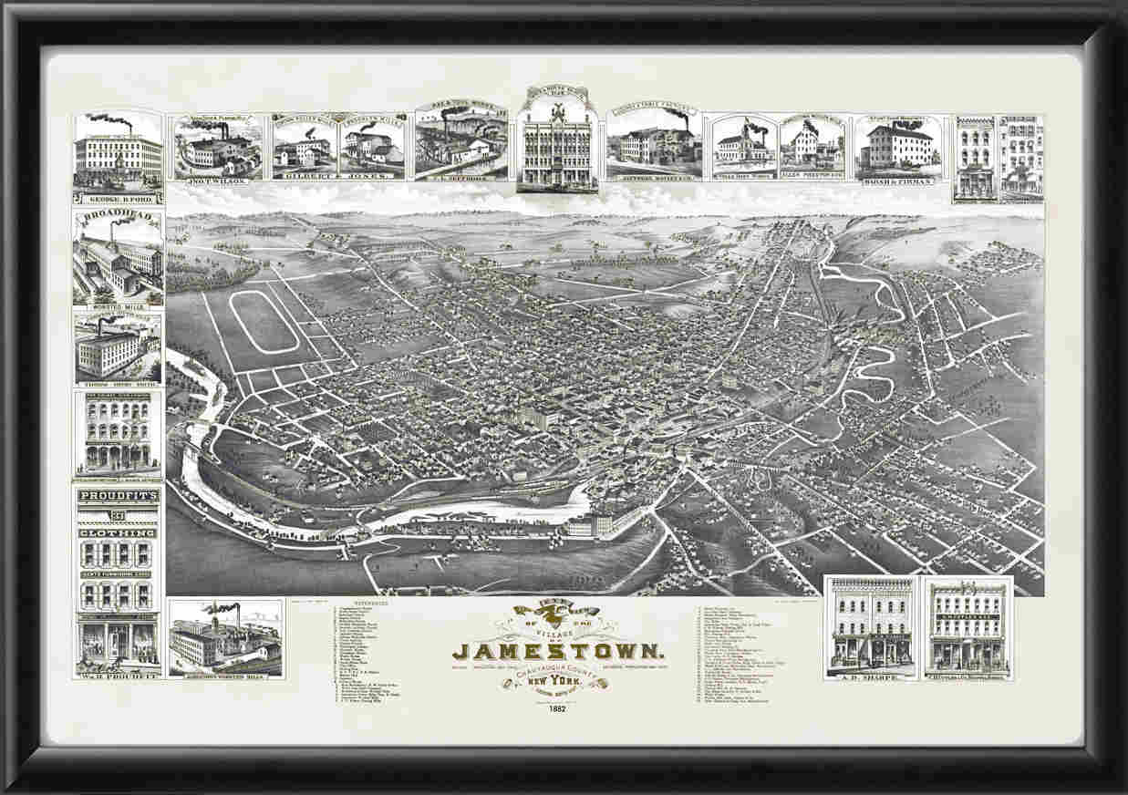 Restored bird’s eye view map of Jamestown, New York, 1882 by Herman Brosius.