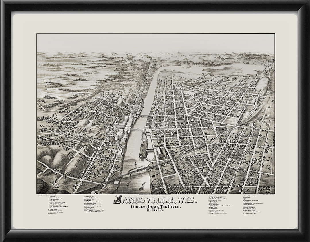 Restored bird’s eye view map of Janesville, Wisconsin, 1877 by C.H. Vogt