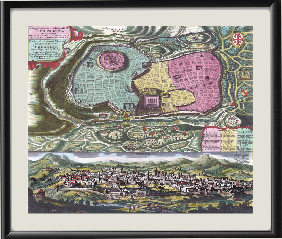 Restored view of Jerusalem, Israel, produced in 1734 by Matthaeus Seutter from the city plan by Juan Bautista Villalpando and bird’s eye view by Matthaus Merian.