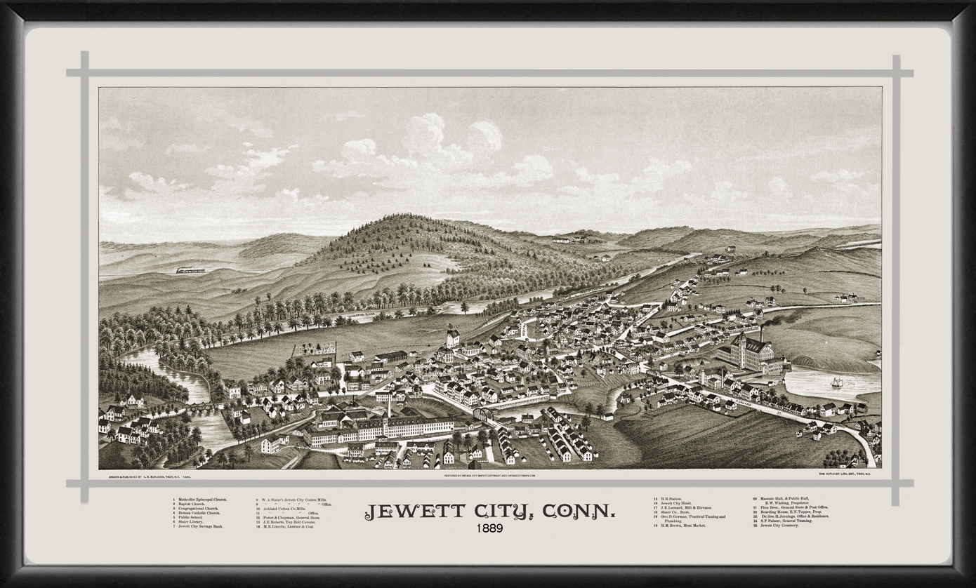 Restored bird’s eye view of Jewett City, Connecticut, 1889 by Lucien R. Burleigh.