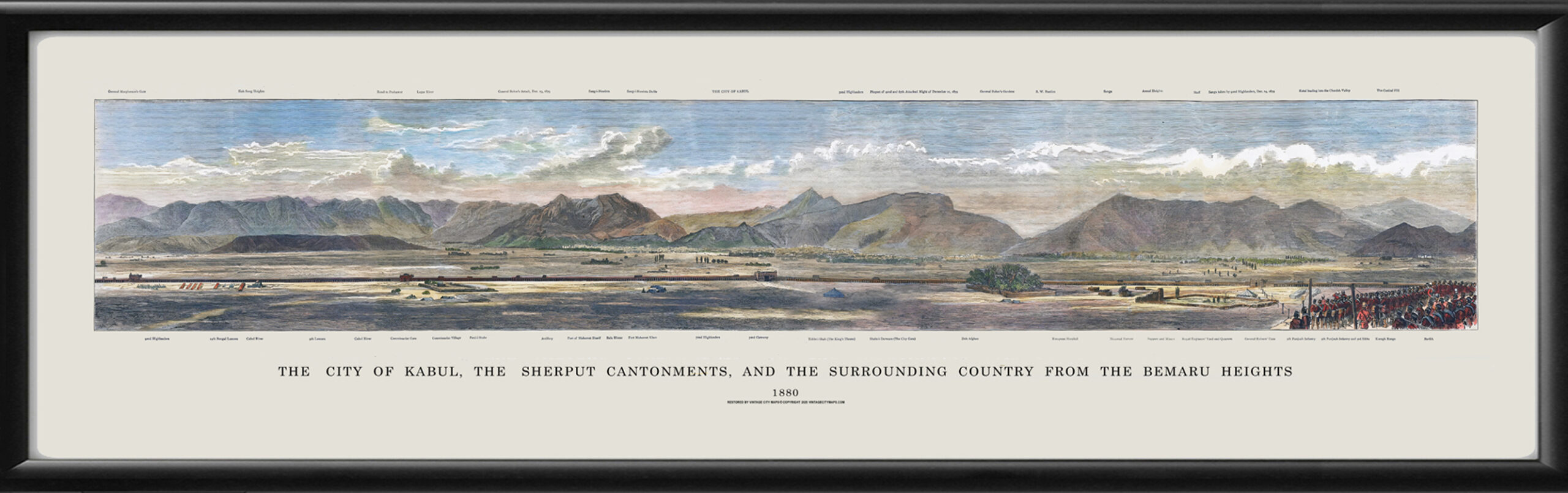 Restored panoramic view of Kabul, Afghanistan, the Sherput Cantonments, and the surrounding country from the Bemaru Heights, 1880 from the original woodcut engraving published in The Graphic Magazine