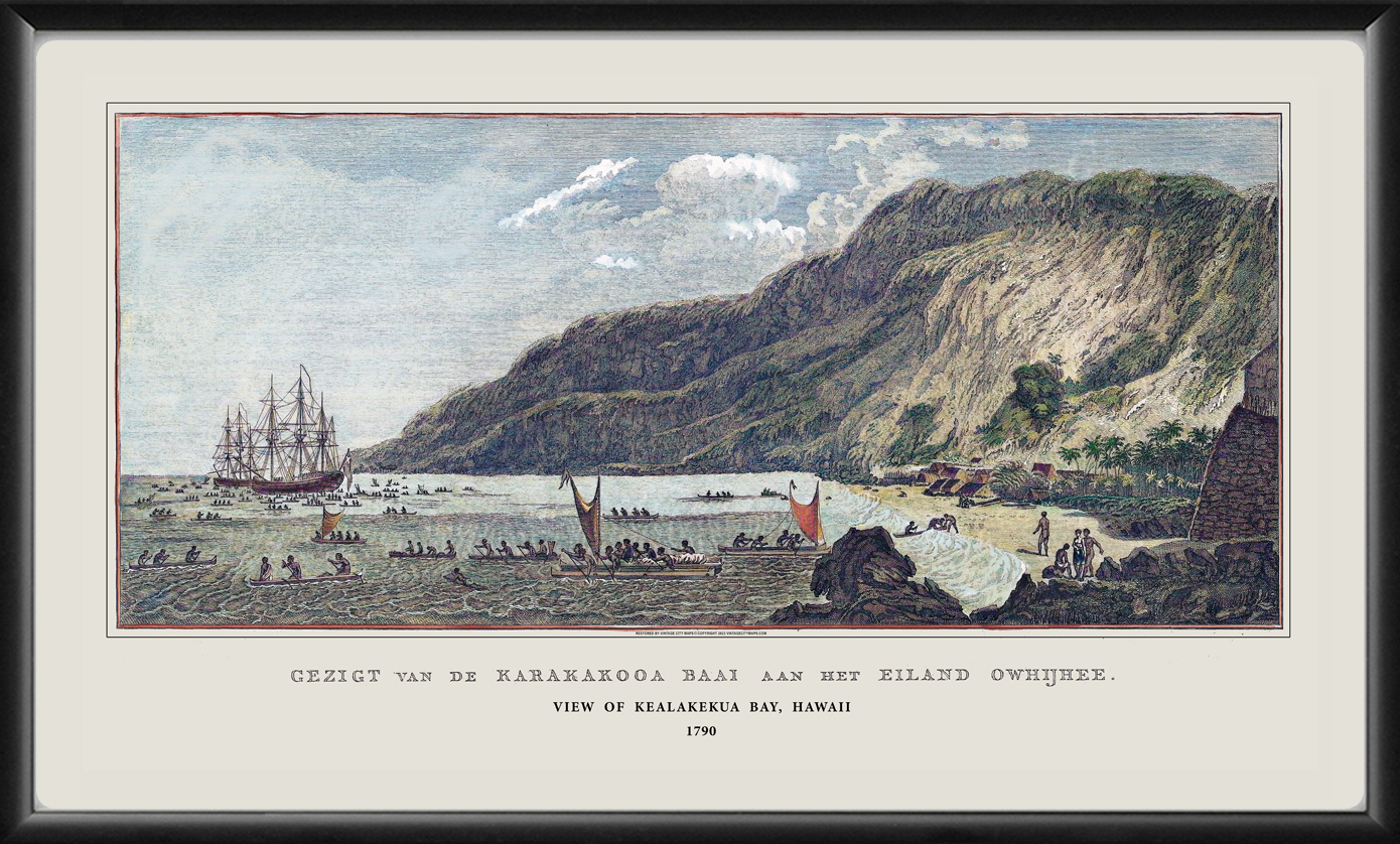 Restored view of Karakakoa Bay, Hawaii, 1790 – “Gezigt van de Karakakooa Baai aan het Eiland Owhijhee” – by James Webber