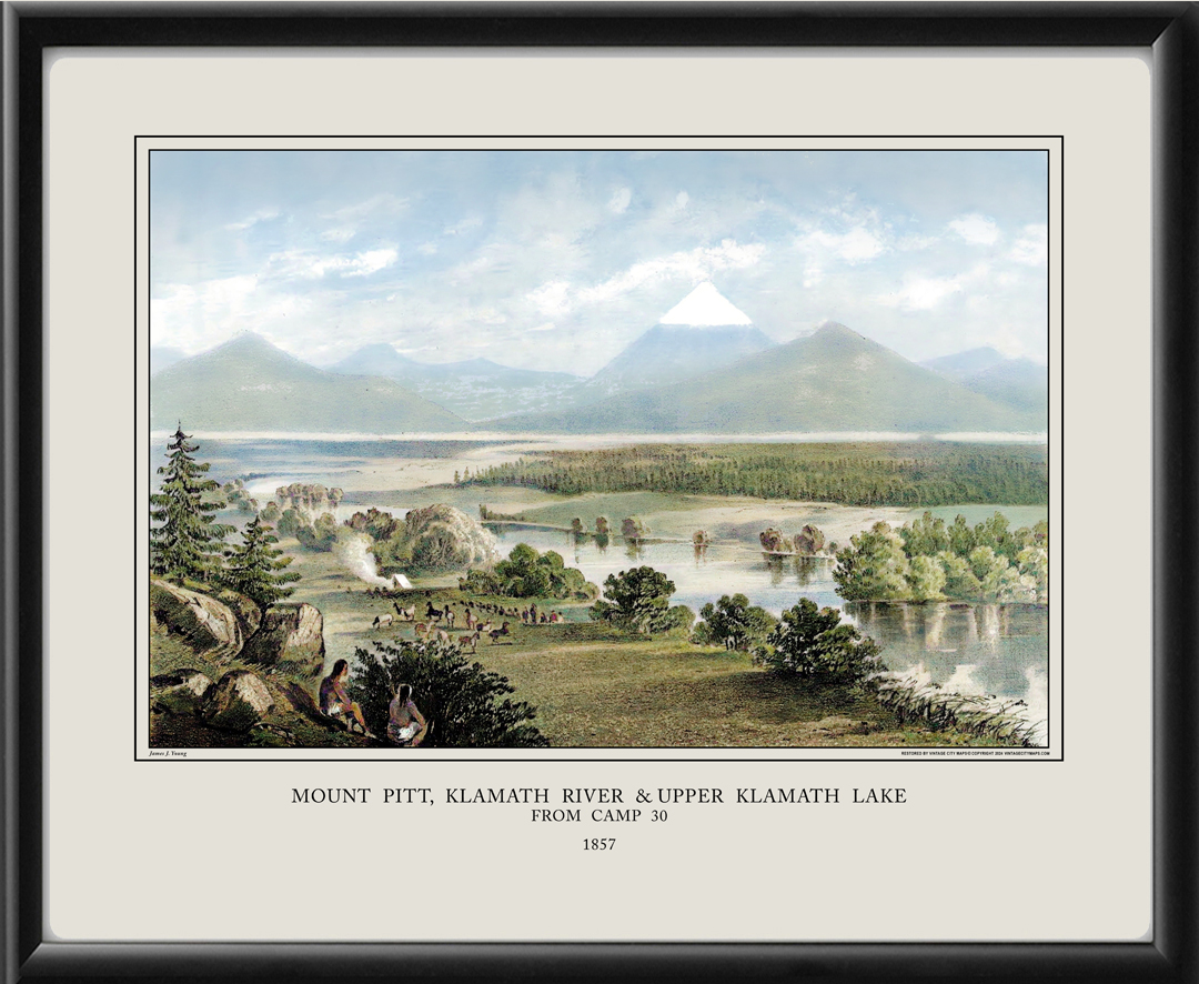Restored panoramic view of Mount Pitt, Klamath River & Upper Klamath Lake, Oregon, 1857 from an original sketch by John J. Young