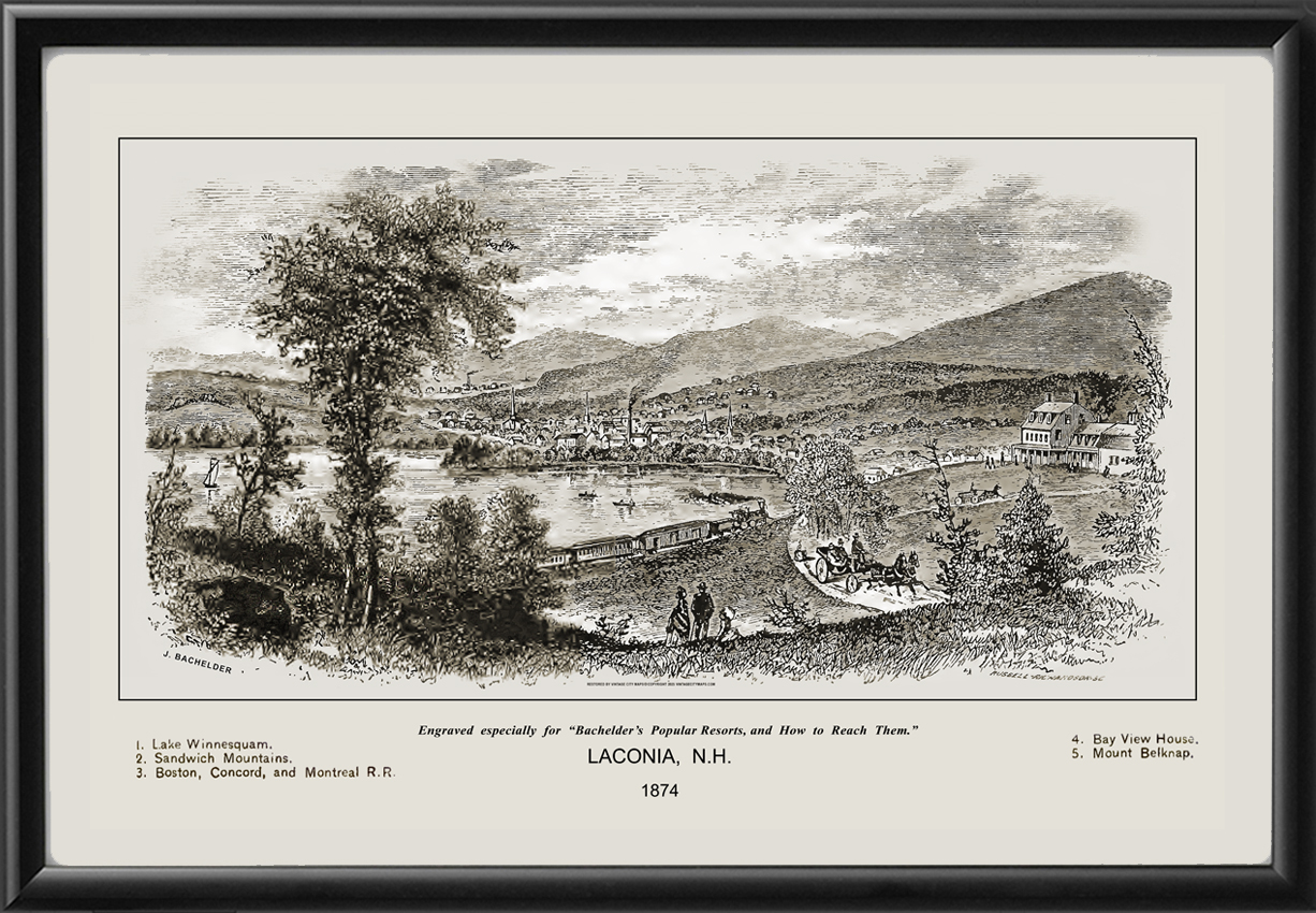 Restored bird’s eye view of Laconia, New Hampshire, 1874 from the original engraving in John B. Bachelder’s publication, “Popular Resorts and How to Reach Them.”