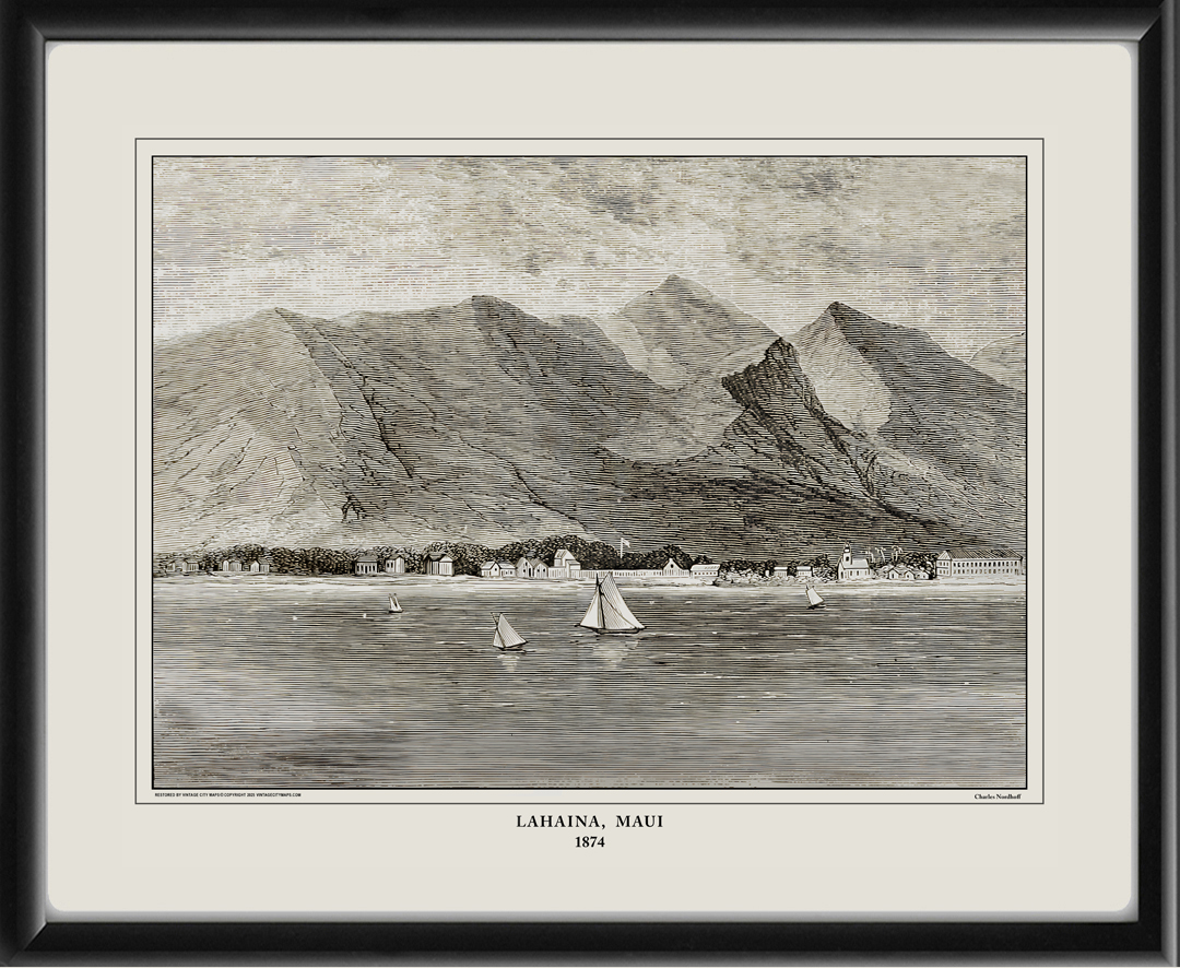 Restored bird’s eye view of Lahaina, Maui, Hawaii, 1874 from the “Northern California, Oregon, and the Sandwich Islands” by Charles Nordhoff and Jules Remy