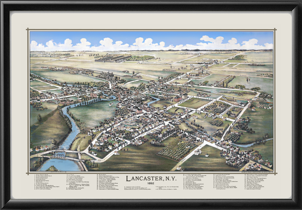 Restored bird’s eye view map of Lancaster, New York, 1892 by Lucien R. Burleigh