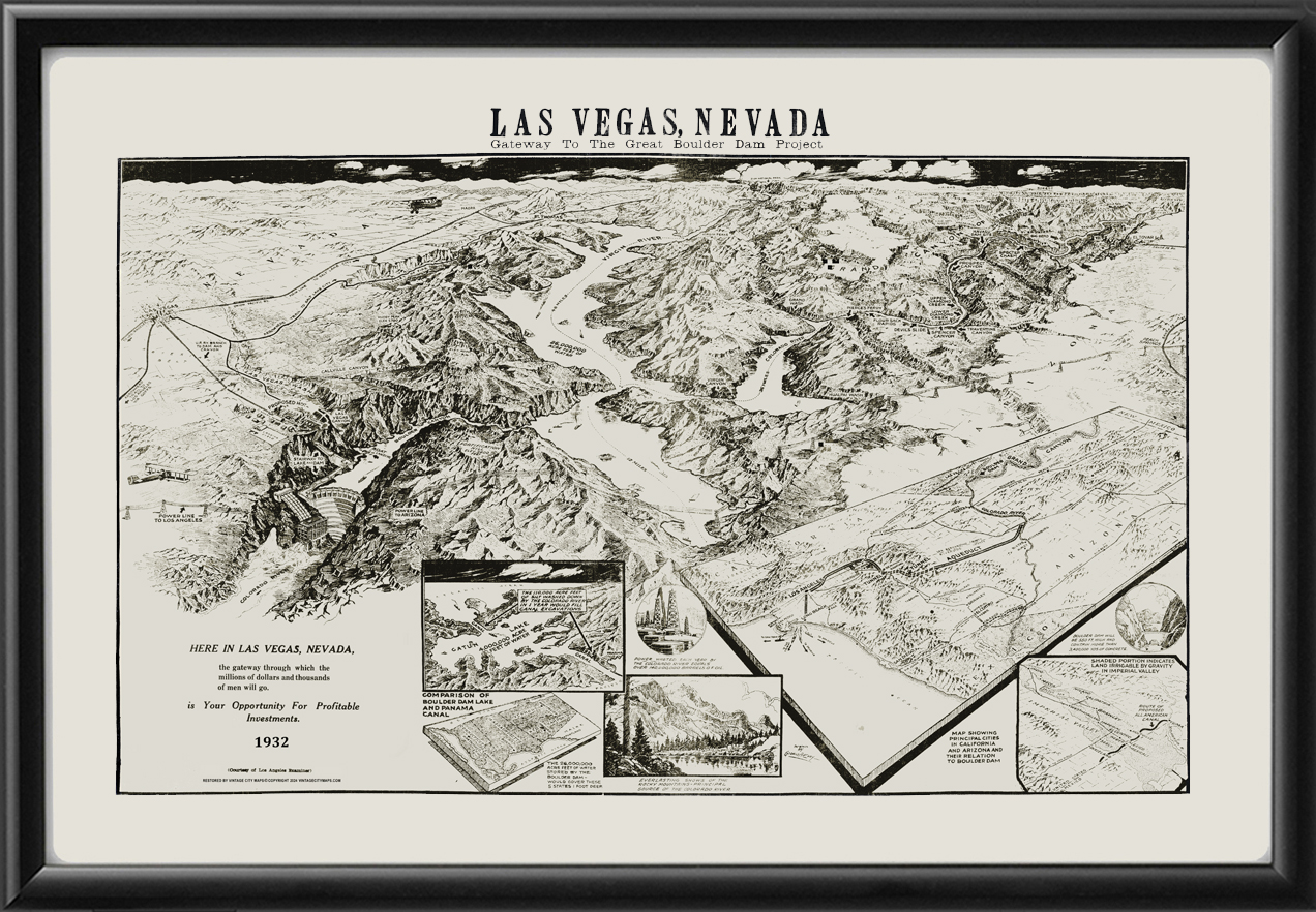 Restored bird’s eye view of Las Vegas – Nevada Gateway To Great Boulder (Hoover) Dam Project 1932 by Gerald Eddy, showing insets of the massive amount of water stored, the height of the dam, and a comparison of the dam with the Panama Canal.