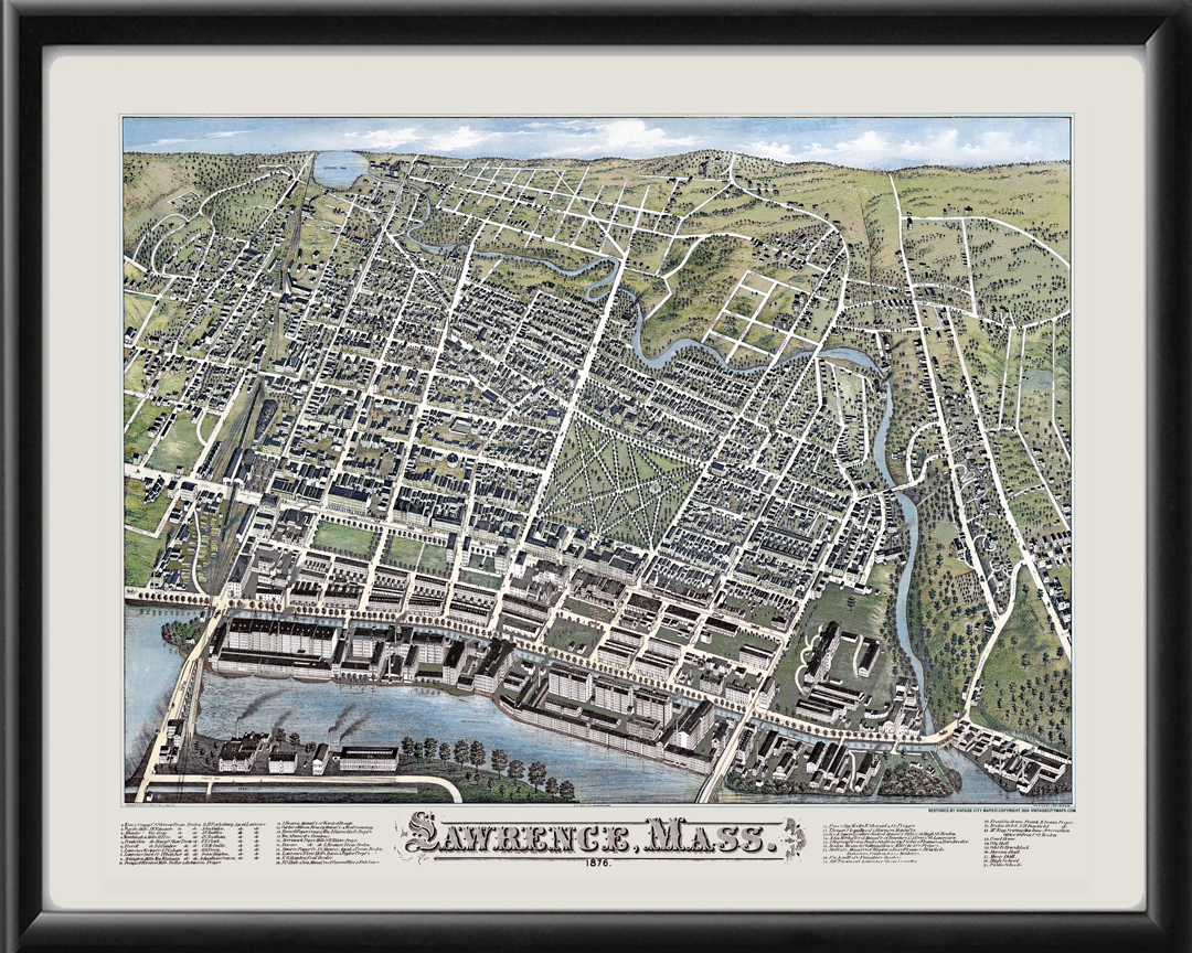 Restored bird’s eye view map of Lawrence, Massachusetts, 1876 by H. H. Bailey.