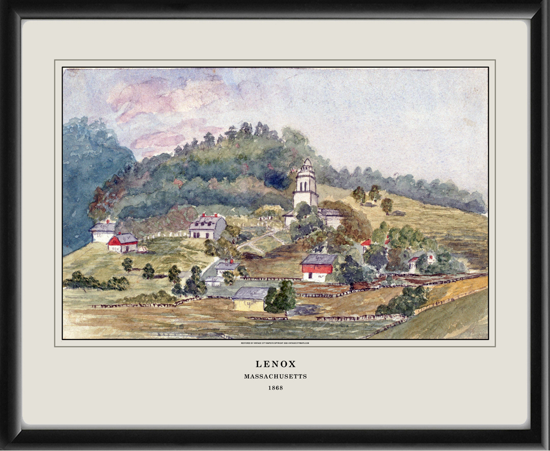 Restored bird’s eye view of Lenox, Massachusetts, 1868 from the original watercolor painting by Eliza C. Cleveland, showing the school house, Grace Kuhn’s house, barn, Miss Liring’s house, and congregational meeting house