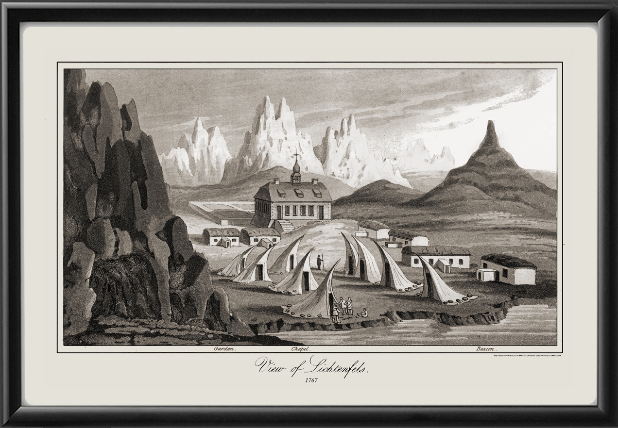 Restored bird’s eye view of the town of Lichtenfels on the west coast of Greenland, showing Inuit dwellings, garden, chapel, and beacon, 1767 by David Cranz