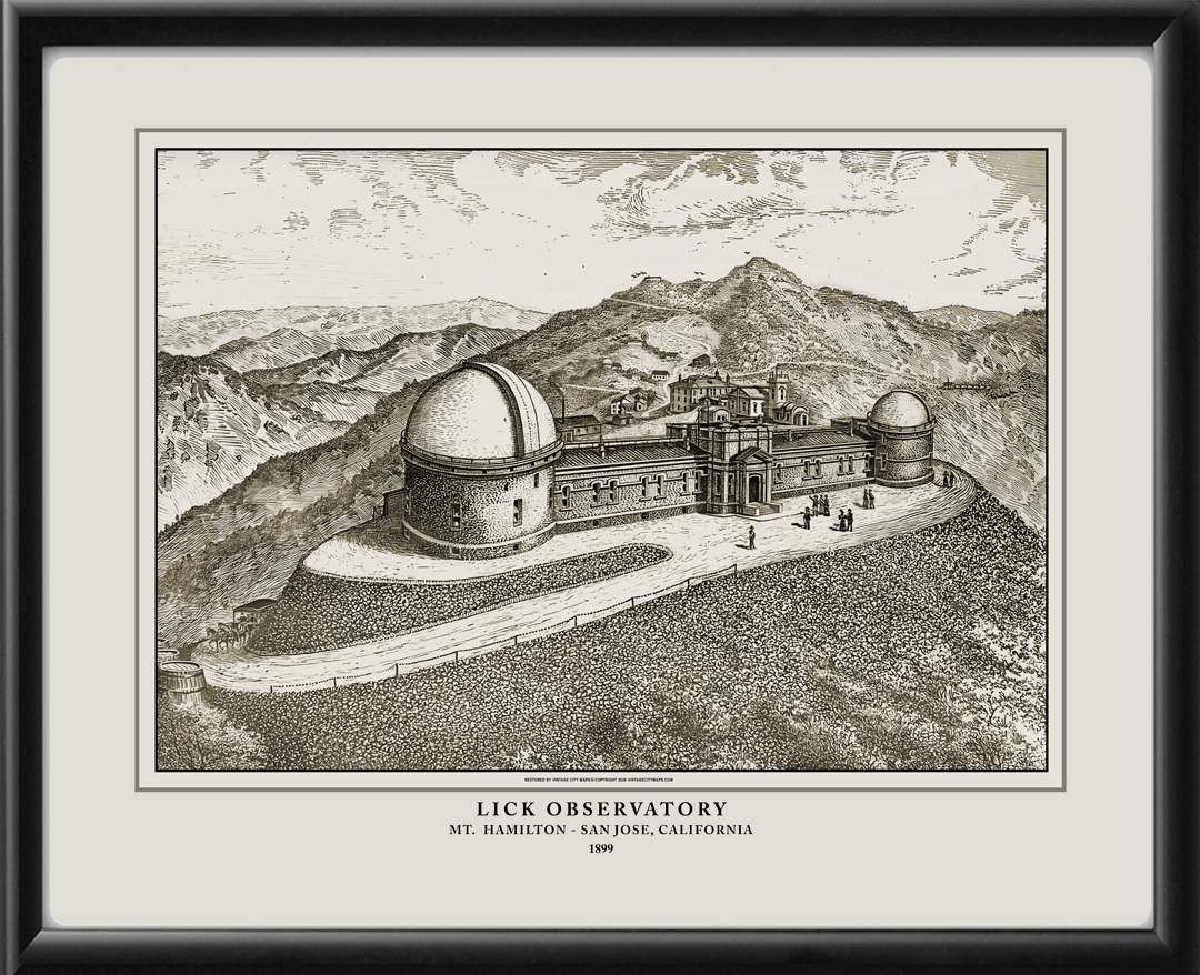 Restored bird’s eye view of the Lick Observatory on Mt. Hamilton near San Jose, California, 1899. It was the world’s first permanently occupied mountain-top observatory and home to the 36-inch Great Lick Refractor, which was the largest refracting telescope at the time of its completion in 1888.