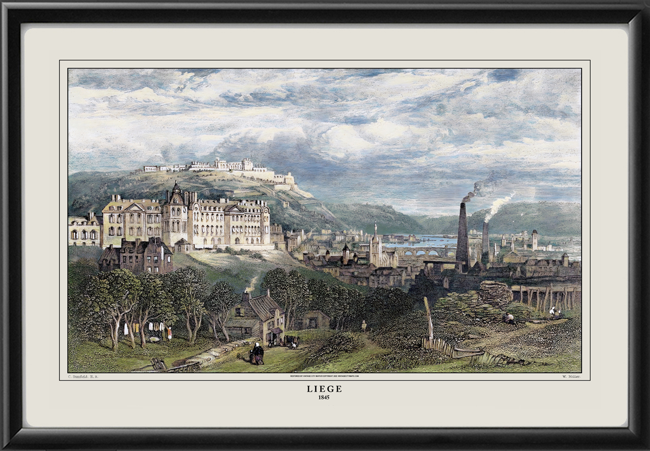 Restored bird’s eye view of Liege, Belgium 1845 from the original engraving by William Miller, based on the drawing by C. Stanfield