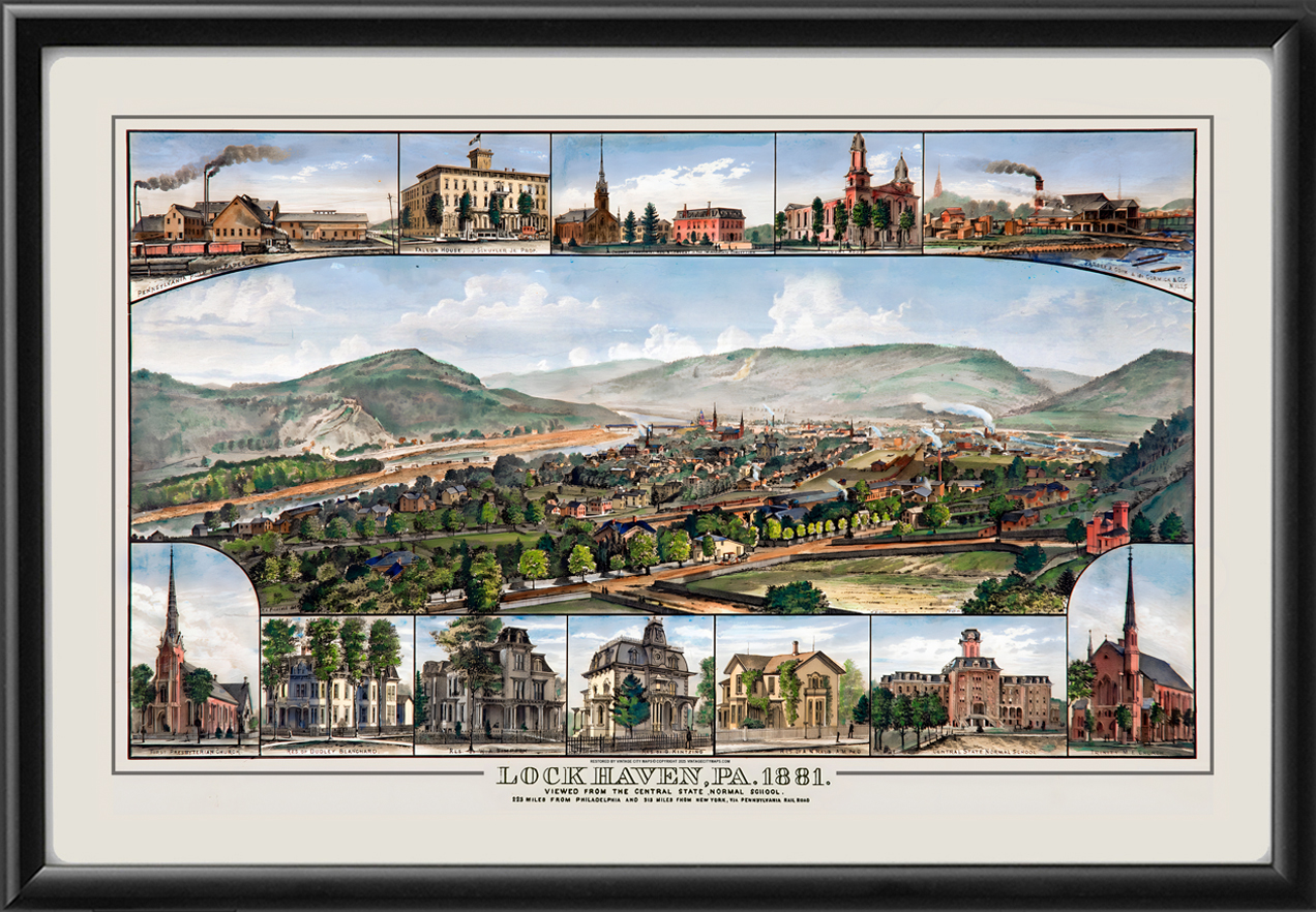 Restored bird’s eye view of Lock Haven, Pennsylvania, 1881 by William A. Porter, viewed from Central State Normal School (Lock Haven University), and showing insets of residences, factories, and churches.