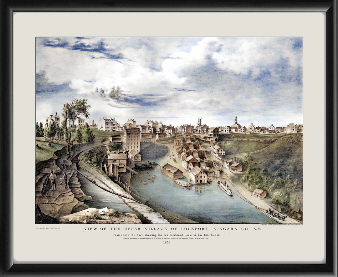 Restored bird’s eye view of Lockport, New York, 1836 W. Wilson (color version). Showing the ten combined locks on the Erie Canal.