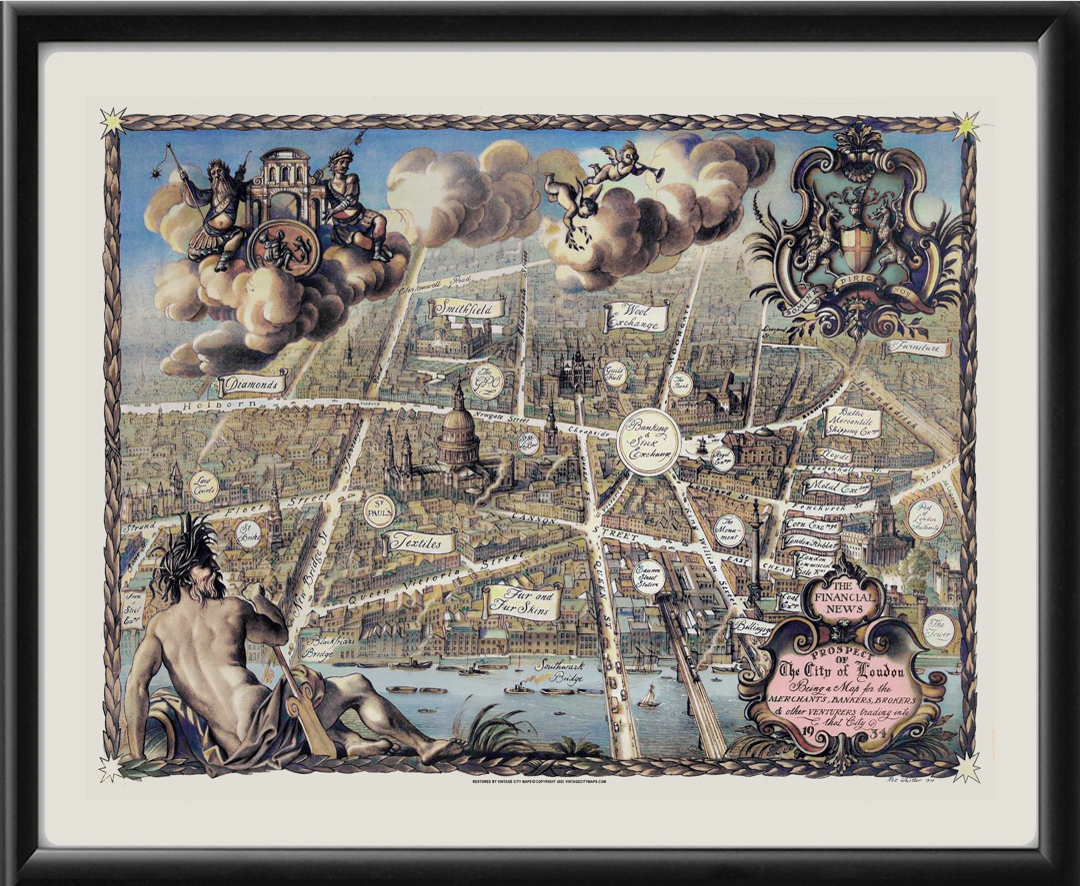 Restored bird’s eye view of London, England, 1934 by Rex Whistler, produced as a map for the merchants, bankers, brokers, and other venturers trading into that city.