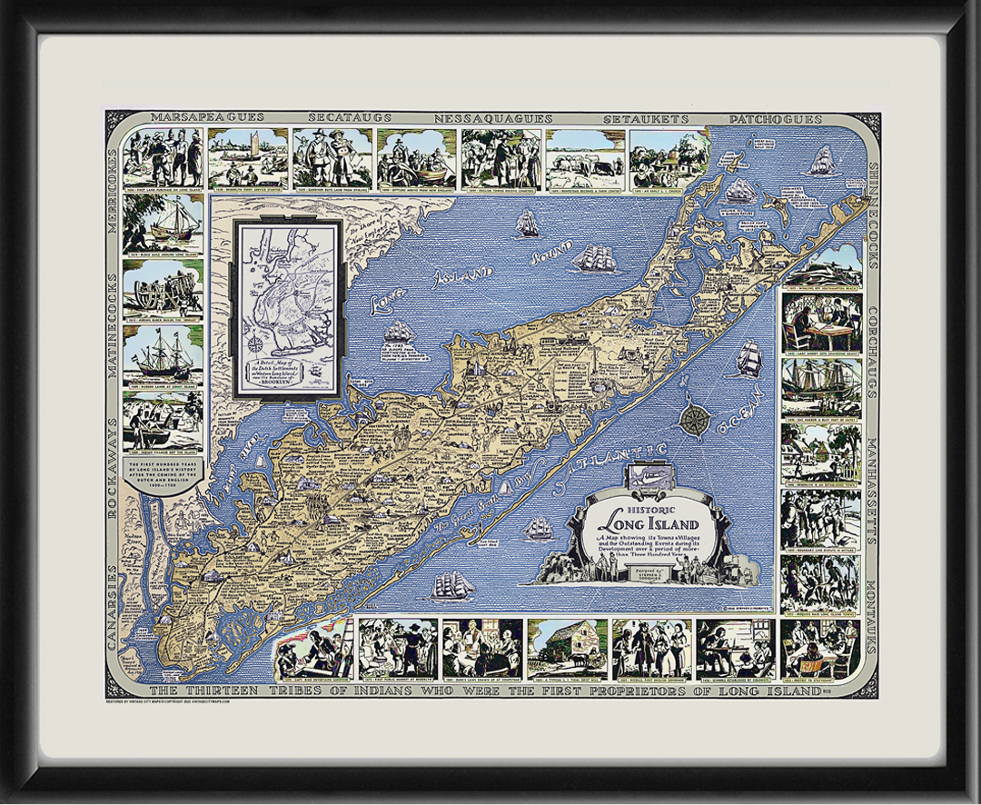 Restored pictorial bird’s eye view map of Historic Long Island, showing its towns, villages, and the outstanding events during its development over a period of more than three hundred years, produced in 1936 by Stephen Voorhies