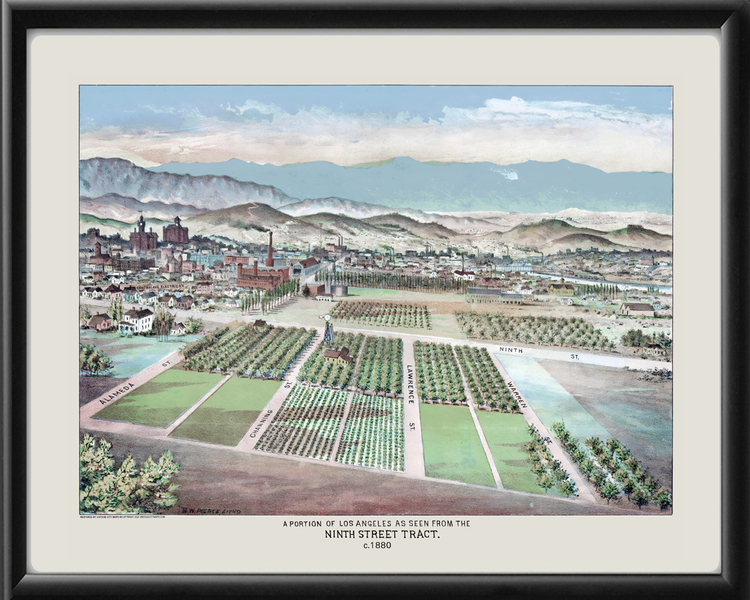 Restored bird’s eye view of Los Angeles, California, 1880 showing the Ninth Street Tract, by Bruce Wellington Pierce.